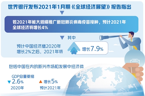 经济日报讯:美国当地时间1月5日,世界银行发布2021年1月期《全球经济展望》报告指出,若2021年能大规模推广新冠肺炎病毒疫苗接种,预计2021年全球经济将增长4%。其中,预计中国经济继2020年增长2%之后,2021年将增长7.9%。